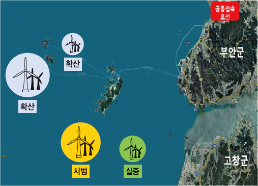 전북 서남권 해상풍력 현황 (2011년 정부 「서남해 해상풍력 2.5GW 종합추진계획」에 따라 개발 중)