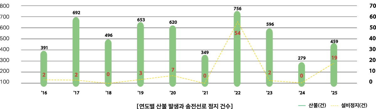산림과 전력설비는 이처럼 숙명적으로 공존할 수밖에 없는 구조이다. 그러나 기후 위기로 인해 매년 대형화·일상화되고 있는 산불은 이 평온한 공존을 위협하고 있다. 전력설비는 국가 경제와 국민 삶의 근간이기에, 불길이 산을 타고 번질 때마다 우리는 전력계통의 안녕을 위해 총력을 다해 사투를 벌이고 있다.