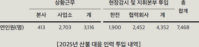 현장 중심의 비상 대응 2025년 영남권 초대형 산불 당시, 본사와 사업소 인력은 물론 협력회사까지 포함하여 연인원 약 7,500여 명을 현장에 투입했다.