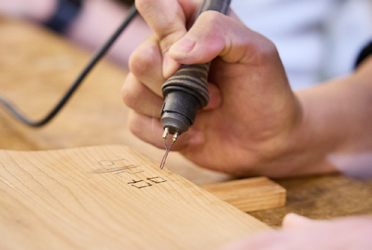 이제 에어건으로 먼지를 날린 도마를 물티슈로 깨끗하게 닦아내고, 우드버닝(Wood Burning)으로 글씨를 새겨 넣기 위해 연습용 나무토막에 버닝펜으로 글씨를 연습했습니다. 각자의 이름이나 가족들의 이니셜을 새겨보면서 실수하지 않기 위해 연습부터 많은 심혈을 기울였습니다. 연습이 끝나고 도마에 직접 이름을 적으면서, 세상에 하나뿐인 내 도마라는 게 실감이 나기 시작했습니다.